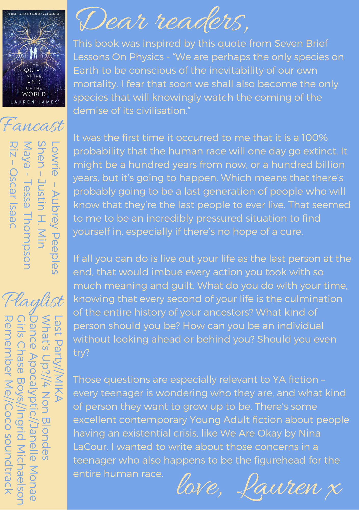 But at the back of my mind, the quote and idea were clearly simmering away because three months later in June 2016, I was backpacking around Cambodia. I woke up in the middle of the night in a grotty youth hostel and scrambled for my travel notebook and wrote out a book idea. It was about the last boy and girl born after humanity stopped being able to conceive, who have to watch the human race go extinct.